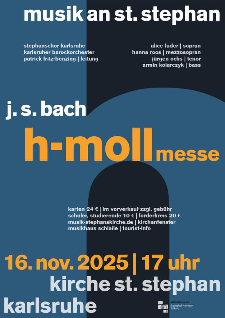 Johann Sebastian Bachs „größtes musikalisches Kunstwerk aller Zeiten und Völker“ – wie seine h-moll-Messe schon früh bezeichnet wurde – erklingt am 16.11.2025 mit Alice Fuder, Hanna Roos, Jürgen Ochs und Armin Kolarczyk, dem Stephanschor und dem Karlsruher Barockorchester unter der Leitung von Patrick Fritz-Benzing.